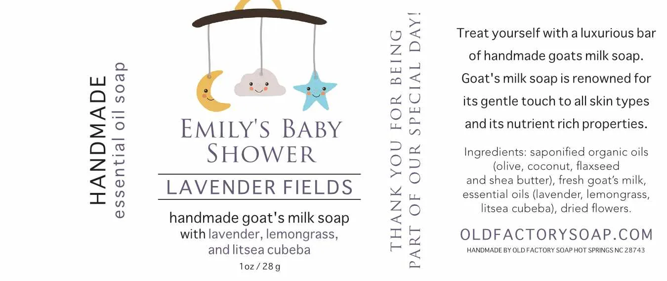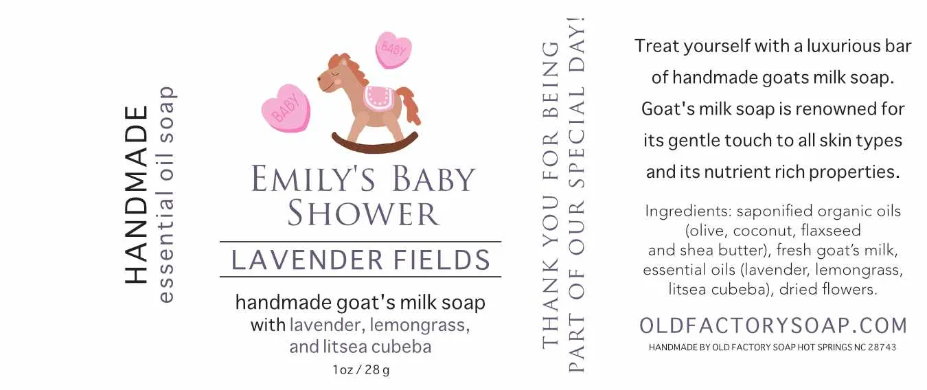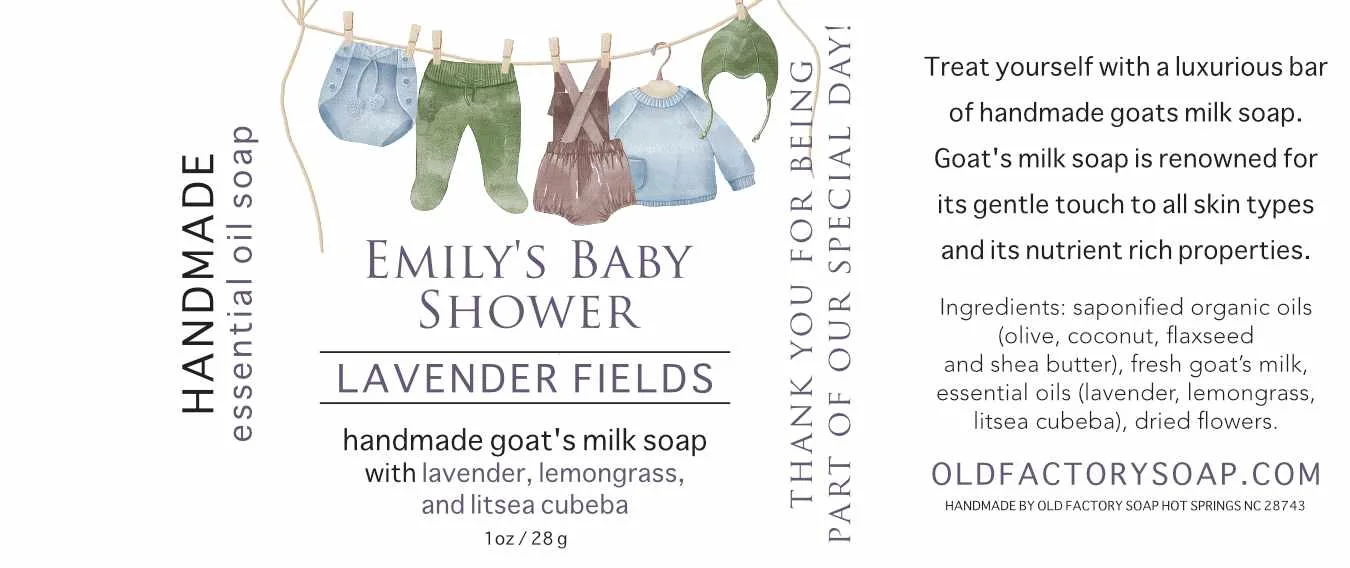 These baby shower party favors can be totally customized with colors, names, dates and more. This amenity size custom soap bar will be a special take home gift that is eco friendly, natural and nourishing for your guests, and something everyone will enjoy. Let us help you create a party favor for your guests to remember! Contact us today, and lets collaborate.