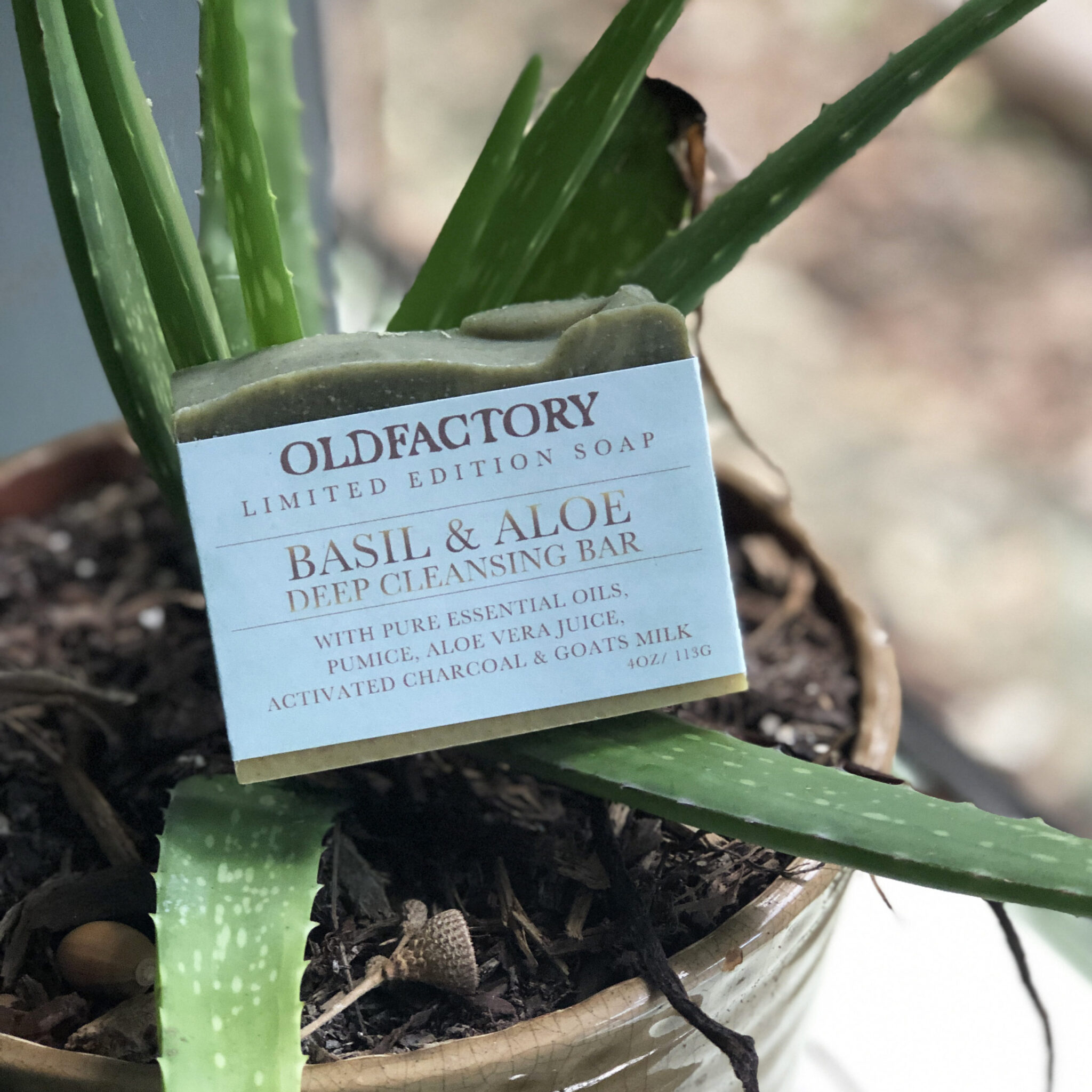 BASIL & ALOE DEEP CLEANSING BAR with pure essential oils, pumice, aloe vera juice, activated charcoal in our goats milk soap recipe. This basil & aloe bar offers lots of deeply cleansing lather, and is freshly scented with pure essential oils of clementine, basil and curcuma. A tiny bit of pumice offers a deep scrub, while activated charcoal boosts lather and helps to carry away impurities. Nourishing carrot powder, aloe vera juice, and parsley powder will keep your hands feeling silky smooth.