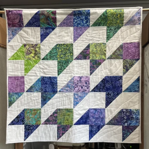 And now for something a little different…. 32 inch x 32 inch square handmade, quilted wall-hanging. This one of a kind piece is handmade with 100% cotton, includes a sewn in pocket on the back for easy hanging. Batik patterned fabric with white threaded quilting on top.
