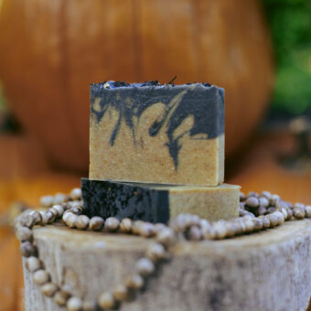 Ingredients: Saponified organic olive oil, organic coconut oil, organic flaxseed oil, organic shea butter, essential oils off Himalayan cedar, clementine, cassia, pennyroyal, powdered neem, turmeric, paprika, black iron oxide, orange peel, black pekoe tea, dried orange peel.