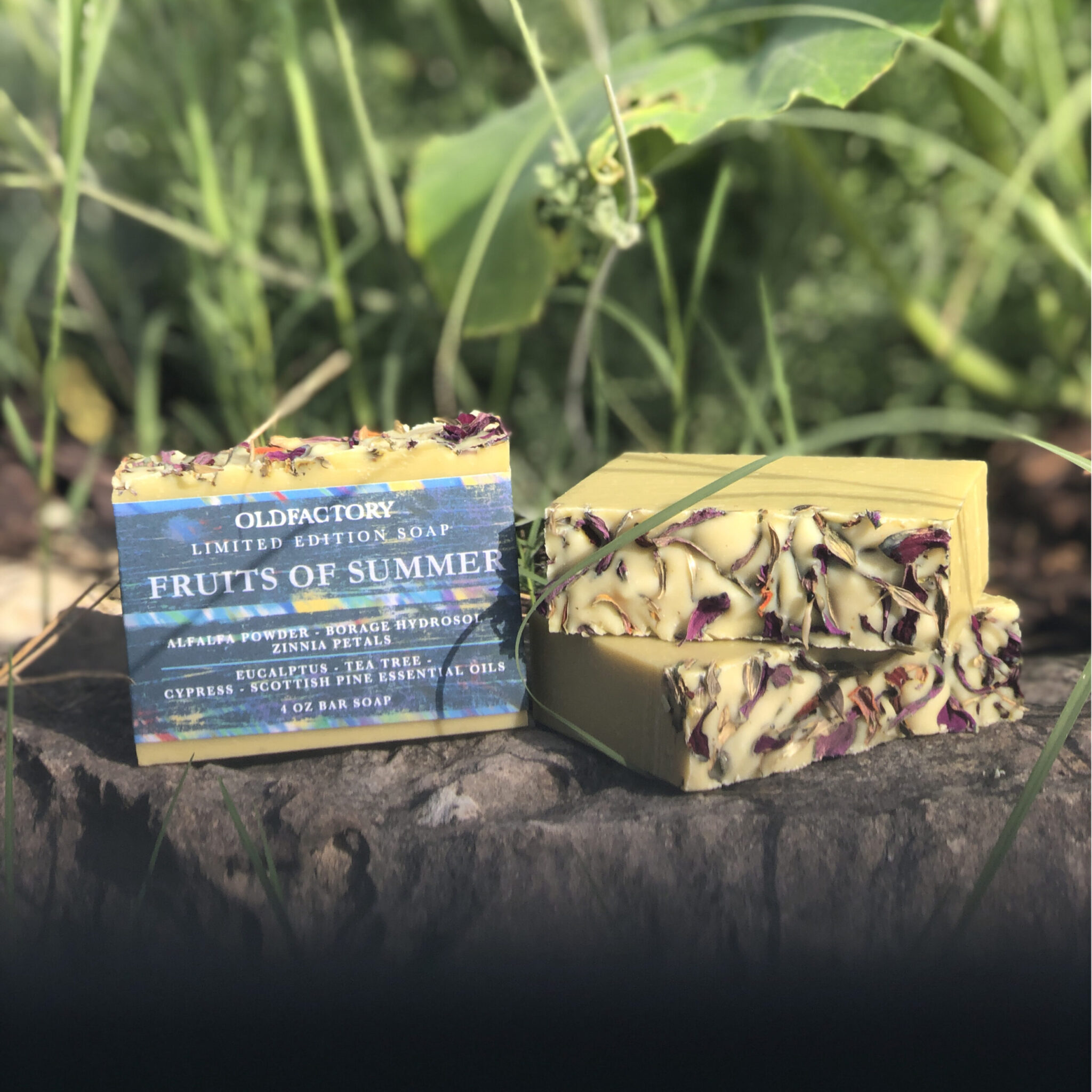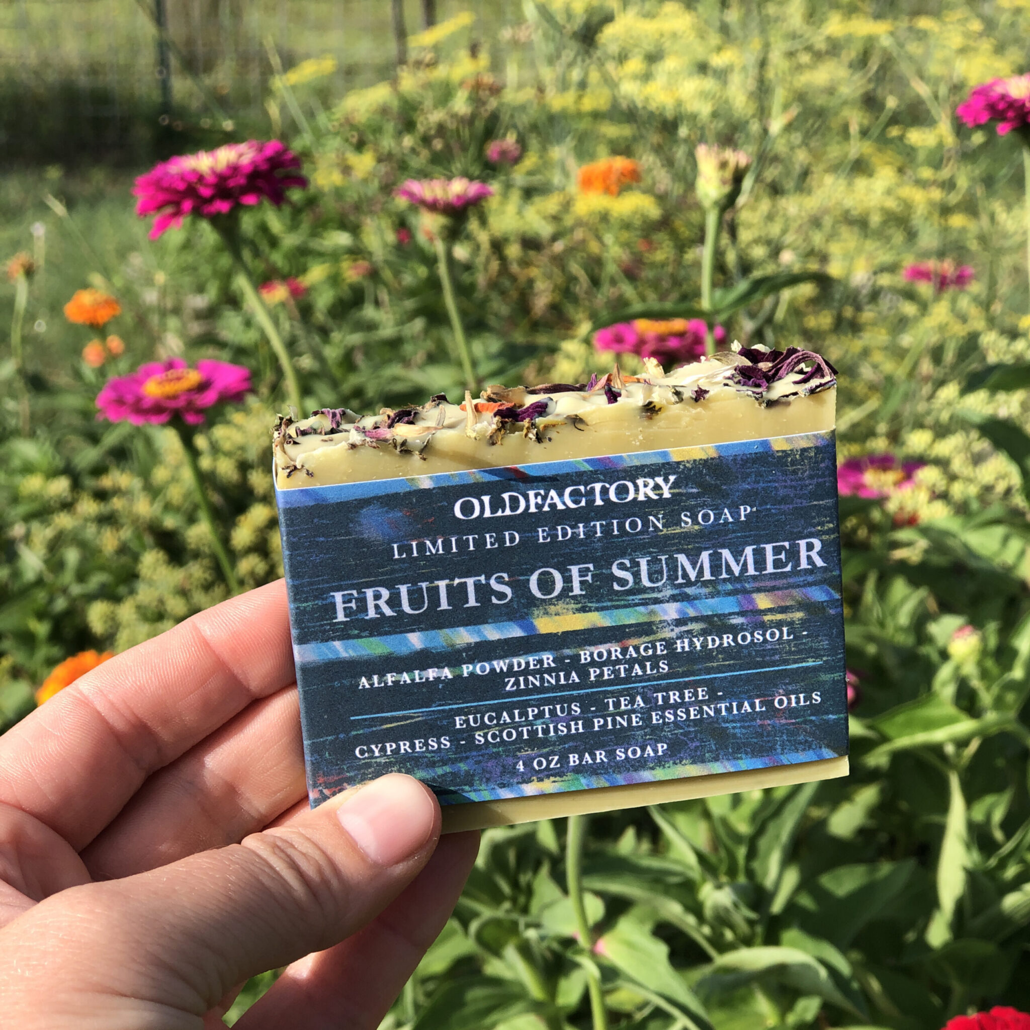 FRUITS OF SUMMER Here we are again, in the midst of summer! Long, hot days – cooler clear nights. A healthy dose of rain this year has made our garden go crazy. Enjoy the fruits of our summer garden featured in this bar of olive oil soap, handmade with house-distilled borage hydrosol. The scent reminds us of a refreshing dip in the river – it features cool notes of eucalyptus, tea tree, cypress, and Scottish pine. On top you will find dried colorful Zinnia petals from our garden.