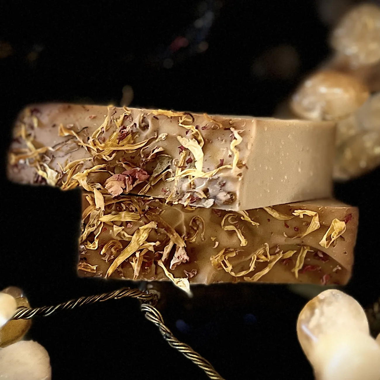 Saponified organic olive oil, organic coconut oil, organic flaxseed oil, organic shea butter, essential oils and absolutes (frankincense, rose, myrrh, vanilla), colloidal gold, organic calendula petals, organic rose petals