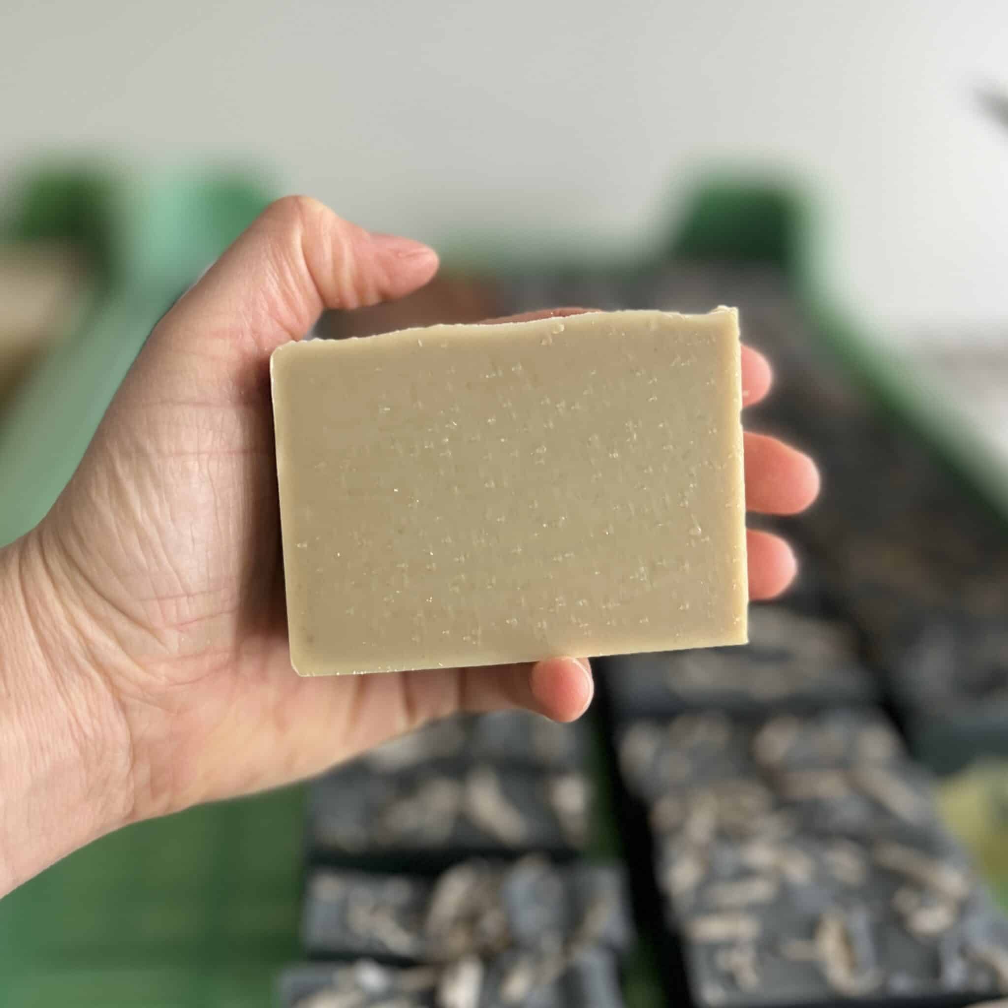 Saponified organic oils (olive, coconut, flaxseed, and shea butter), essential oils of lavender, fir balsam, bergamot, pine tar, green clay
