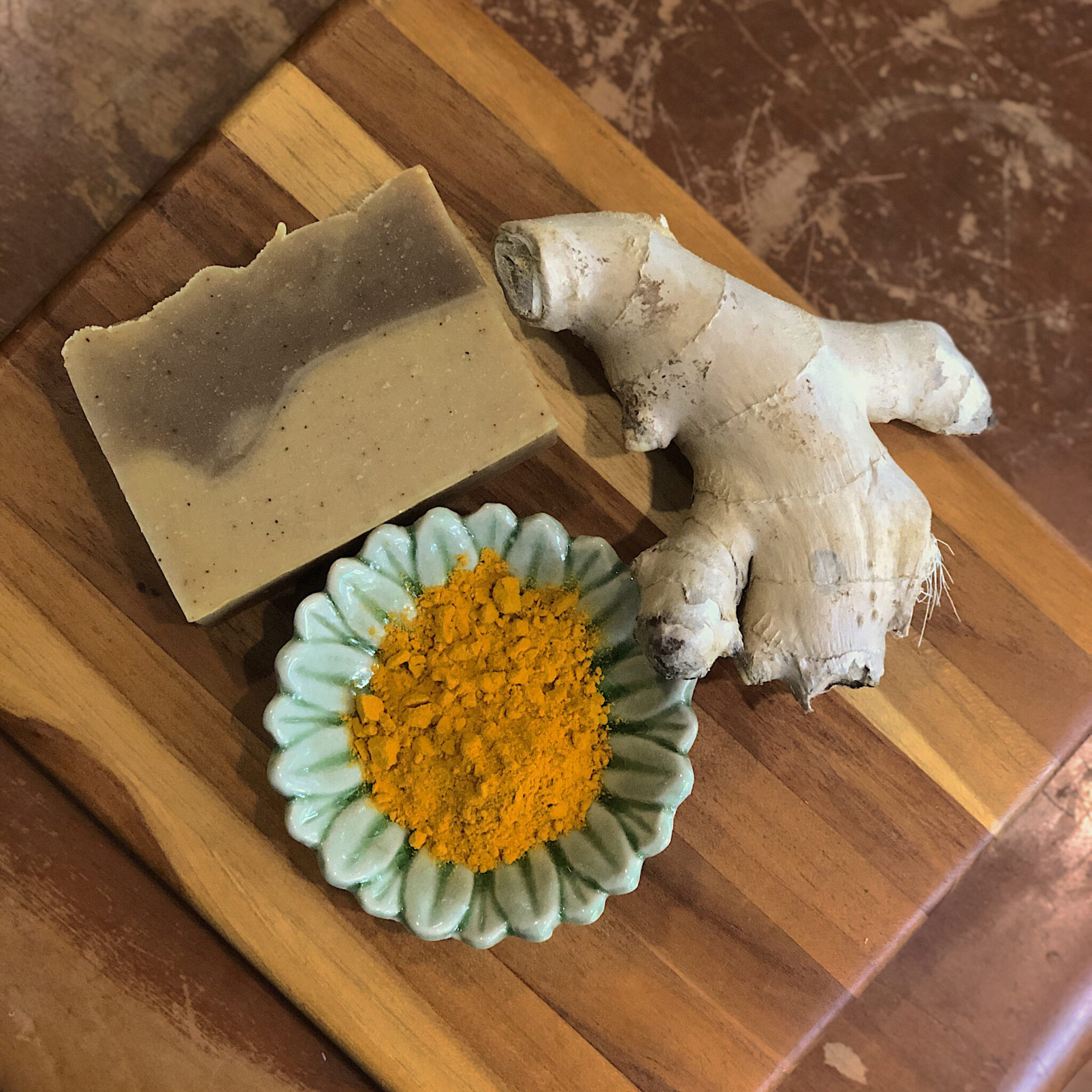 Ingredients: Saponified organic flaxseed oil, organic coconut oil, organic shea butter, organic extra virgin olive oil, fresh goats milk, raw honey, turmeric, essential oils of cinnamon, benzoin, ginger, and black pepper.